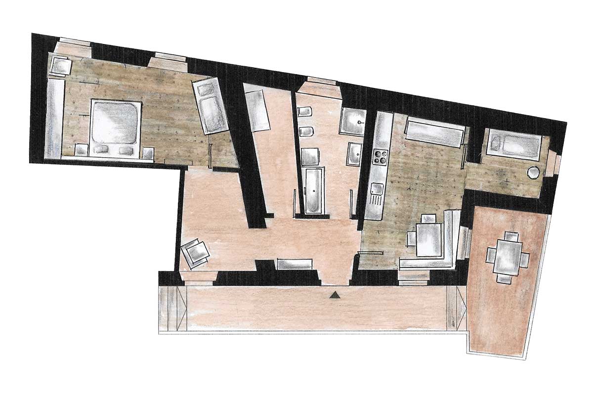 The apartment features a well-equipped kitchen with a dining area and a large bathroom with shower, toilet, bidet, and bathtub. For the little ones, there is a small play corner. On cold winter days, the apartment can be heated with a traditional wood stove and also boasts a spacious terrace. Complimentary toiletries are available in the bathroom.
