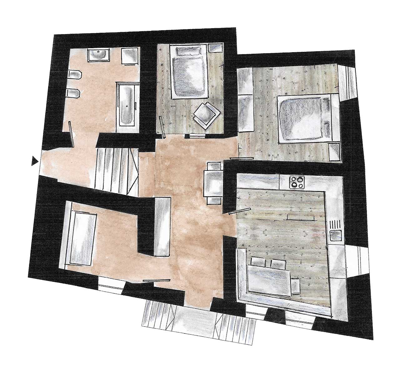 L’ampio appartamento per vacanze (82 m²) al 1° piano ha due ingressi separati. Un ingresso è all’esterno della tenuta con una piccola scala a due lati, il secondo ingresso è direttamente all’interno del cortile di Ansitz Grustdorf. Inoltre, l’appartamento si caratterizza per le sue antiche volte tutelate. L’appartamento non dispone di balcone o terrazza, ma è possibile utilizzare il giardino comune con piscina e prato per prendere il sole. L’appartamento è dotato di una camera matrimoniale, una camera doppia e una camera singola e dispone di una cucina attrezzata di alta qualità con pavimento in legno naturale e zona pranzo. L’ampio bagno è dotato di combinazione doccia-vasca, WC, bidet e lavatrice con asciugatrice. Per i bambini c’è un piccolo angolo giochi nell’appartamento.